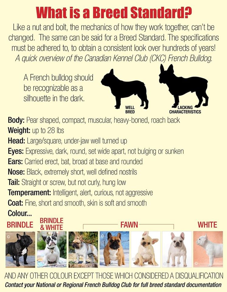 A reputable and responsible breeder only breeds dogs conforming to his or her country’s parent club French Bulldog Breed Standard. The irresponsible breeders who breed for and advertise “rare” colours are intentionally spreading unacceptable colour genes and genes that are linked to health problems through the gene pool. This causes problems for reputable breeders whose main concern is to produce quality puppies. Irresponsible breeders who produce fad colours are profiteers, motivated by greed, because they are able to charge very inflated prices.