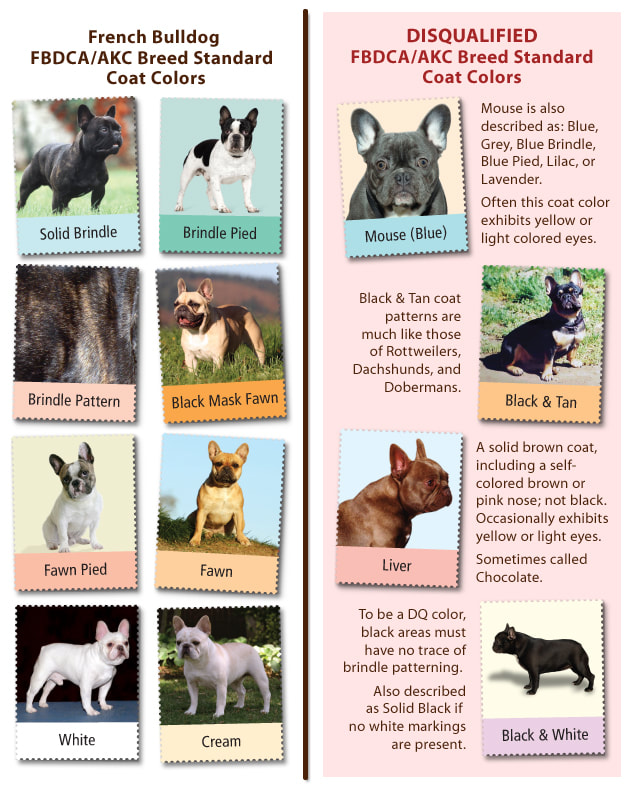 The Canadian Kennel Club recognized French Bulldog colours are: brindle (black with traces of tan striping), cream, fawn, black masked fawn, white, and pied (white with patches of any other recognized colour).